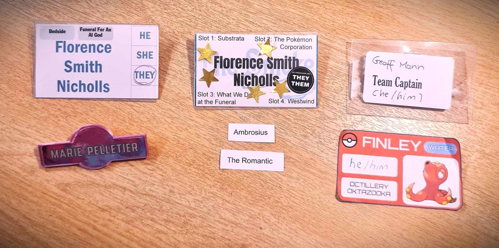 LARP name badges can tell us personal stories, and are also indicative of the design concerns of specific events. Further proof that name badges are interesting designable surfaces is that some LARPs I played at The Smoke had us temporarily adapt them. For example, I slotted the “Finley” name tag into my badge for The Pokemon Corporation LARP. The reason why I have two small slips of paper marked as “Ambrosius” and “The Romantic” respectively is that we were asked to pick our name and epithet and slot them into our name badge for What We Do At The Funeral, a camp vampire LARP. My temporary identity literally overlaid my everyday one.