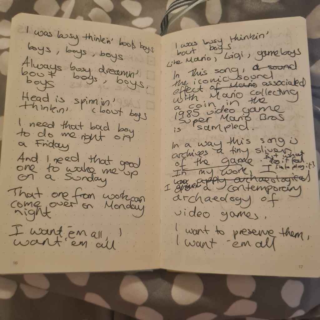 Rather than providing a record of my performance, I want to reflect on the process that went into creating my critical karaoke. I chose the song Boys by Charli XCX because it samples the coin collection sound effect from Super Mario Bros, and sampling also feels like a form of archiving. I wanted to speak both with and against the lyrics of the song, so timing was important. I wrote out all the lyrics by hand in a small notebook, with the words I would perform on the corresponding page so I could keep time.