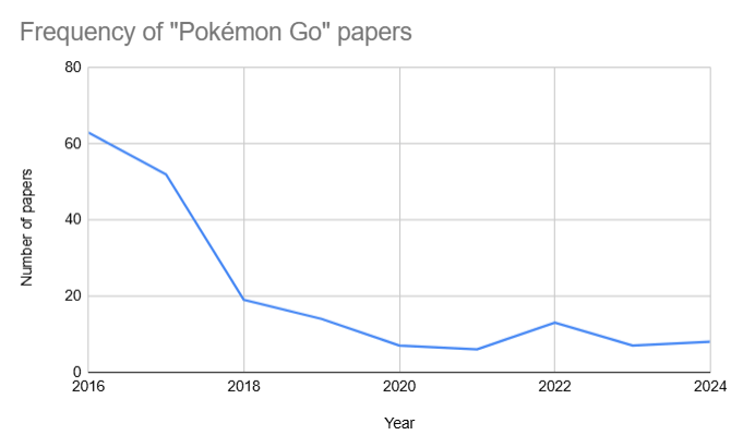 I was curious about the frequency of papers published about specific games over time, so I did a very cursory investigation on Google scholar. I searched for papers with the exact phrase “Pokémon Go” and “Super Mario Bros” in the title and filtered by year. I should stress that this is not a rigorous analysis (there may have been duplications I missed, for example) or the best methodology, but purely for quick illustrative purposes here are the two graphs I produced as a result: